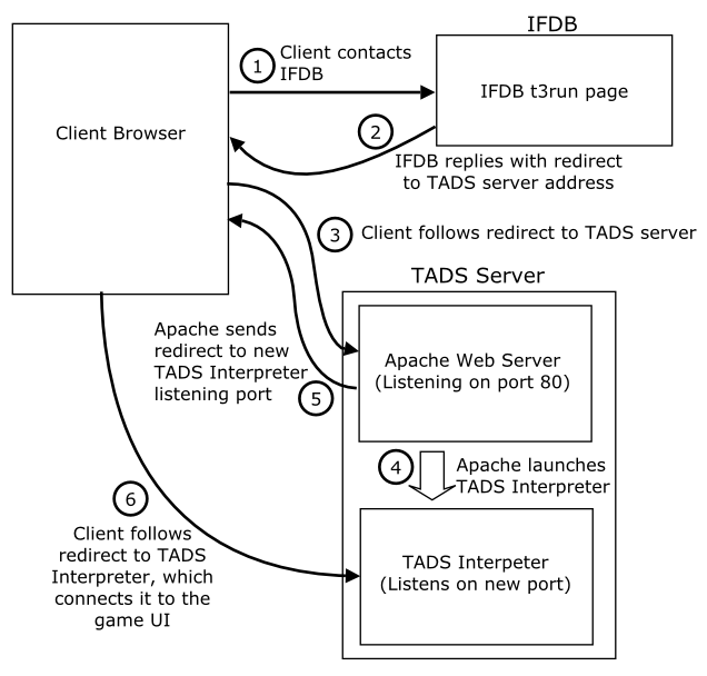 Here's a diagram showing the various steps. Note that the TADS Interpreter process doesn't exist initially - it doesn't exist until step 4, where Apache launches it.